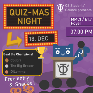 Wir sind glüklich, unser anstehendes Schachturnier endlich auch formell anzukündigen. Dafür kooperieren wir mit dem Hochschulschach, um ein echtes over-the-board Turnier veranstalten zu können! Das Turnier findet am Dienstag, den 16. Dezember, um 16:00 Uhr in E1 1, R. 407 statt. Bitte kommt bereits 10 Minuten früher, um euch bei der Turnierleitung zu registrieren. Wir stellen alles bereit, außer das Schachwissen, also meldet euch einfach ohne weiteres an (es wird allerdings keine Regelerklärungen geben, wir erwarten also, dass du vorher schonmal Schach gespielt hast). Unabhängig eurer Stärke hoffen wir, dass alle viele interessante Spiele haben, euren Scharfsinn messt und eure Gegner herausfordert.