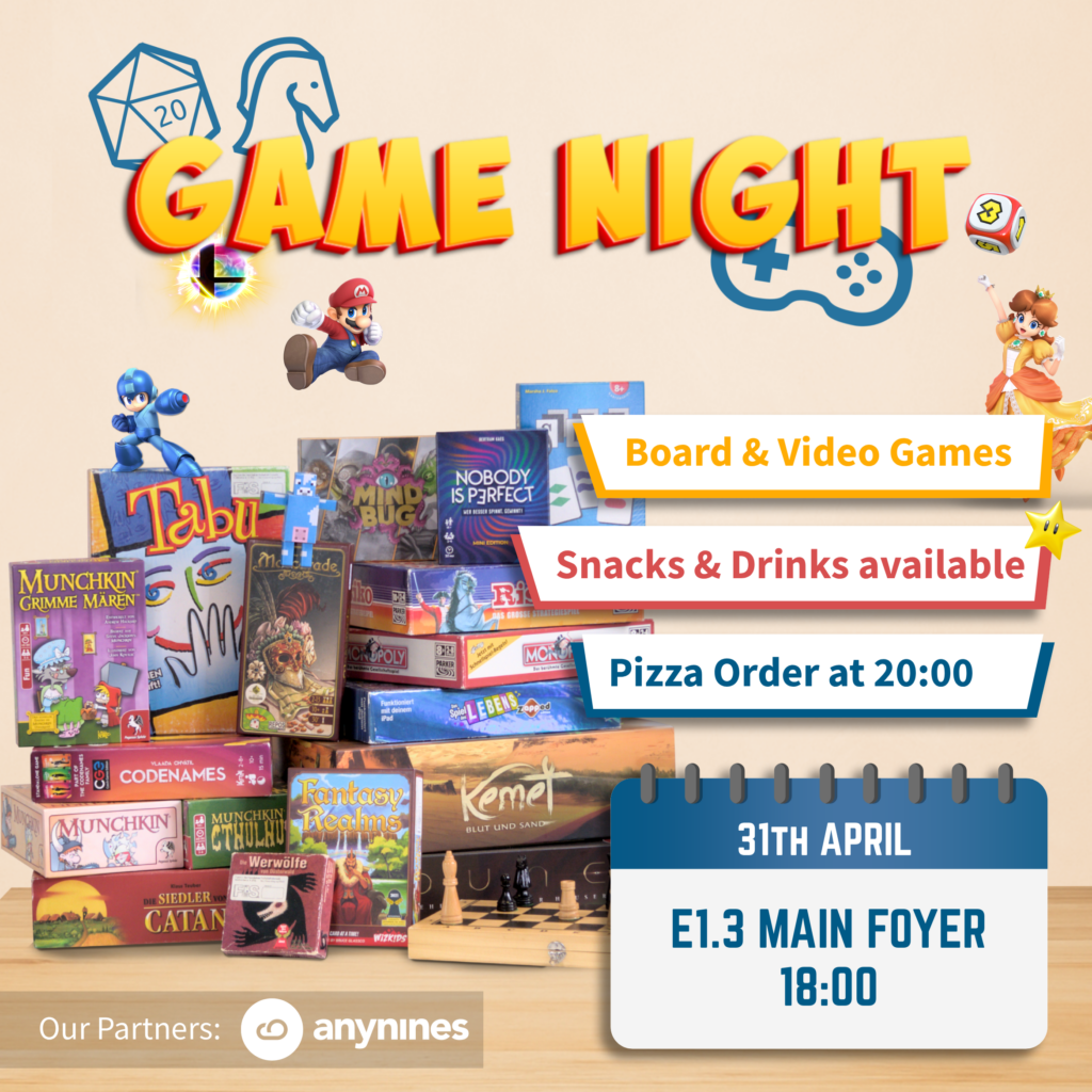 Es ist wieder soweit! Wir haben für euch am Freitag, den 30ten Januar eine weitere Video & Board Game Night im Foyer von E1.3 organisiert, beginnend um 17:00!
