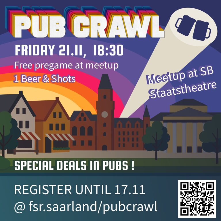 Der FS PubCrawl ist zurück und ist ready euch am 21ten November durch einige der Bars im Nauwieser Viertel zu begleiten! Um teilzunehmen, melde dich bitte bis zum 17ten November über den Link an (fsr.saarland/pubcrawl), damit wir besser planen können…