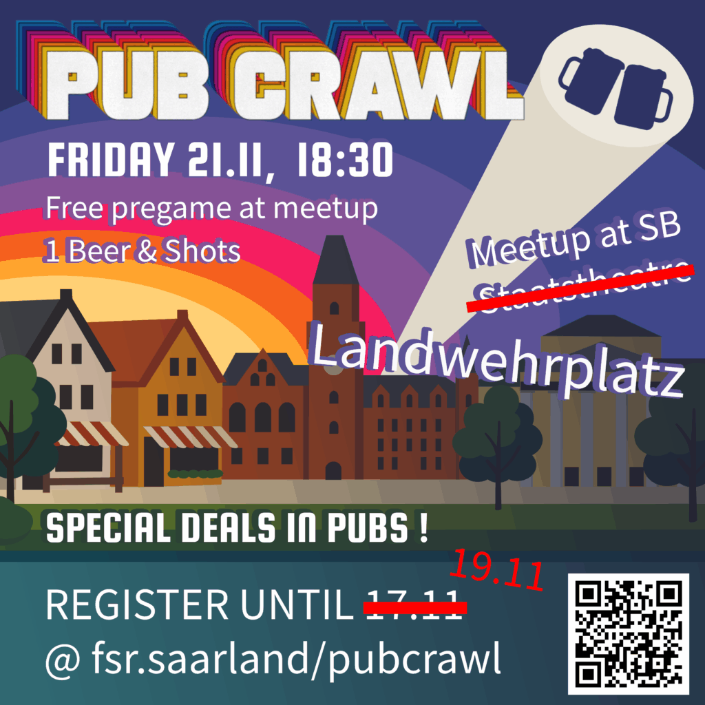 To participate, please register by November 19th via the fsr.saarland/pubcrawl so we can plan accordingly—securing your spot in one of the 4 pub crawl groups, along with your free welcome beer and shot.