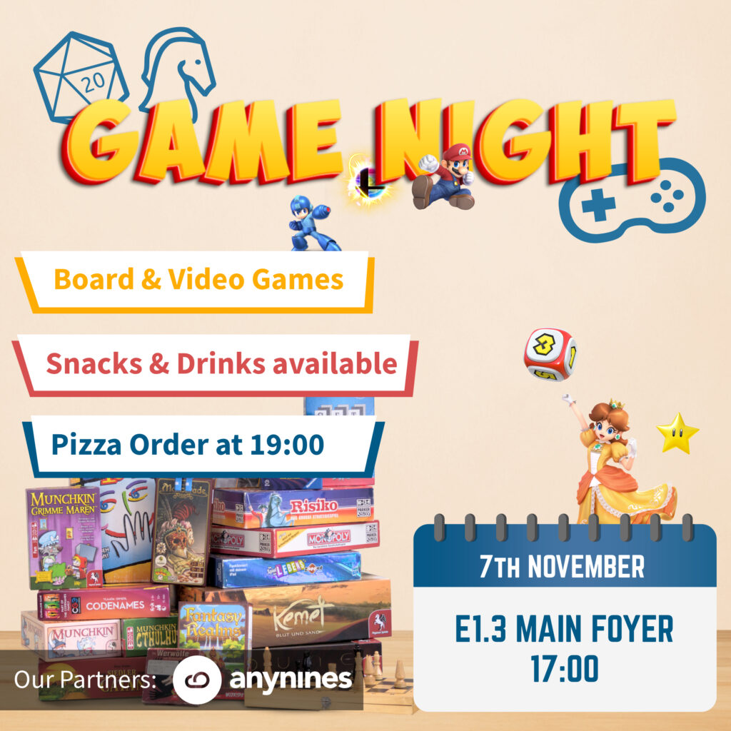 We offer several seminar rooms in which you can play board games in German or English with friends or new fellow students. Additionally, we’ll offer gaming consoles in the foyer where you’ll find games like Mario Kart, Just Dance, Smash Bros, and more. If wanted: Bring your own.