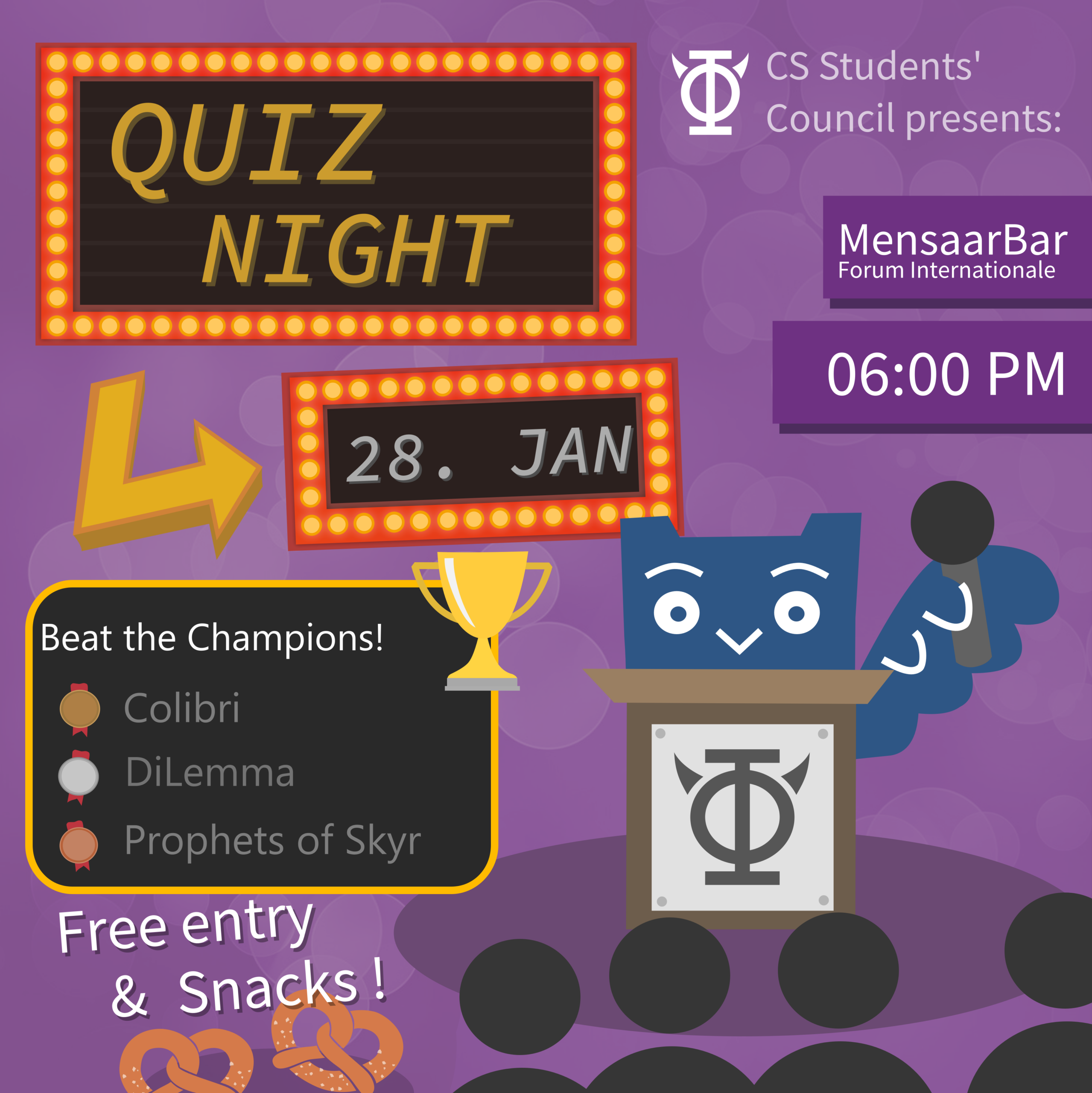 To register your team, just send a mail with the subject “Registration Quiz Night Januar 2026” to lukas@cs.fs.uni-saarland.de with the following information: