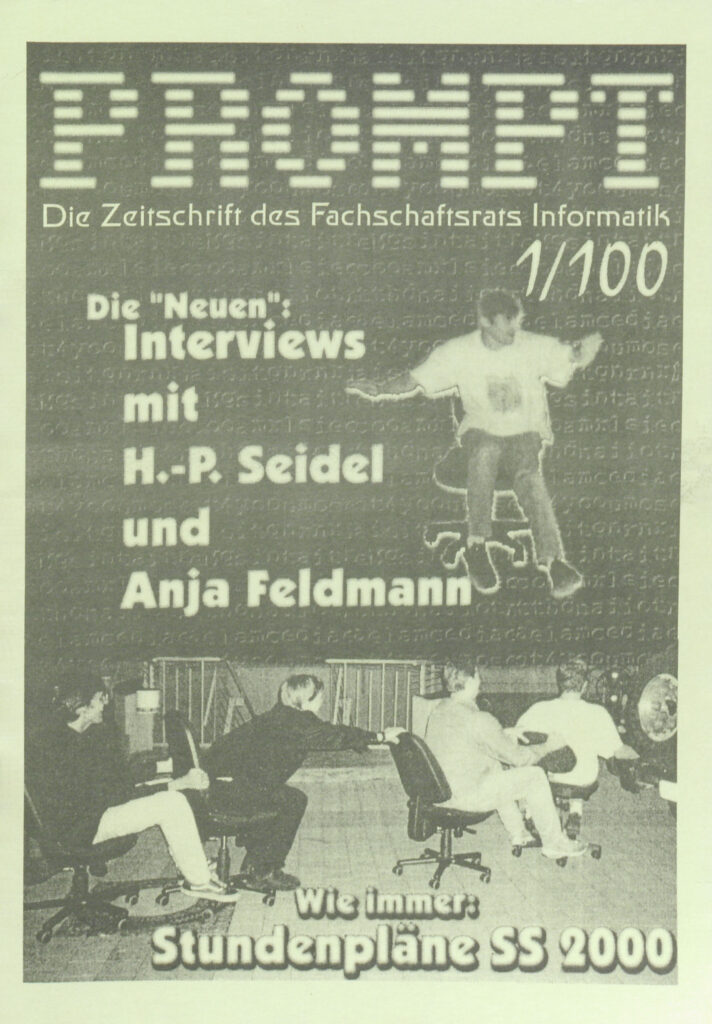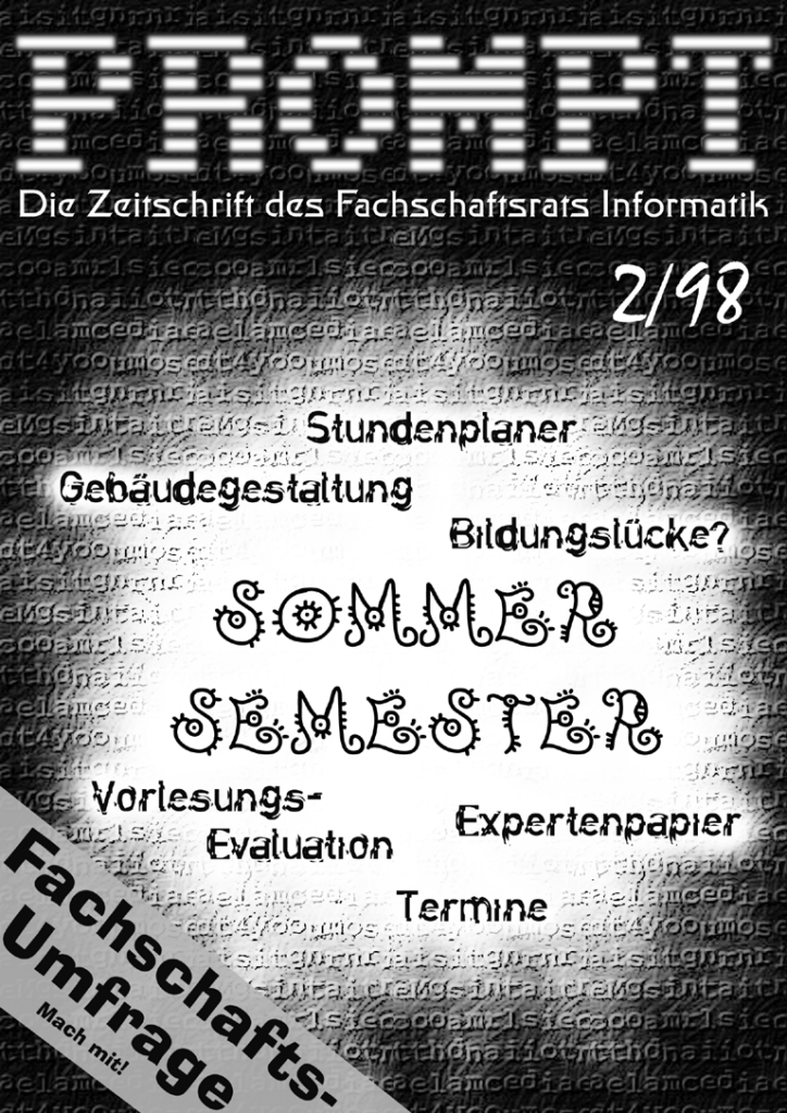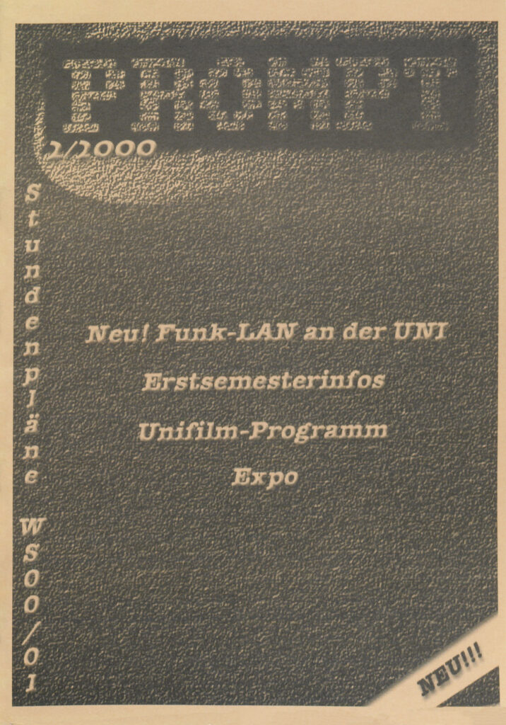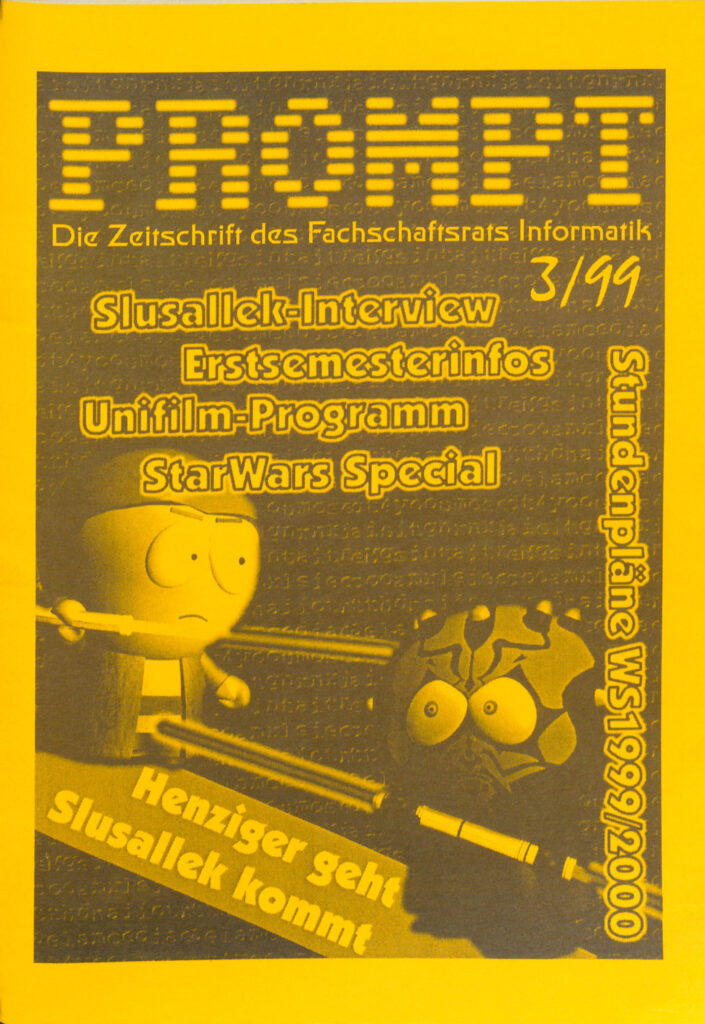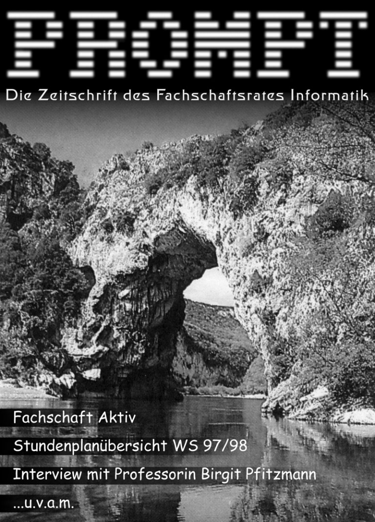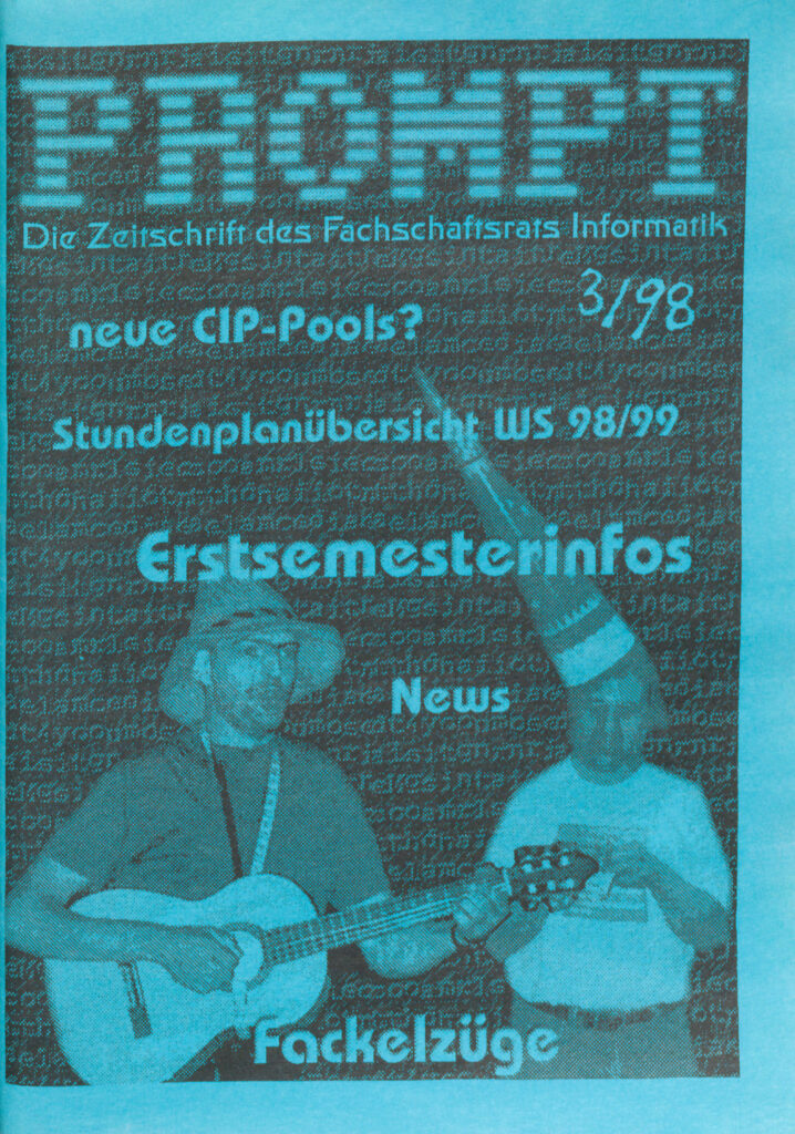 Die Prompt ist die ehemalige Zeitschrift des Fachschaftsrates Informatik, die von spätestens ab 1995 bis mindestens 2004 herausgegeben wurde. Die alten Ausgaben findest du im Untergeschoss der Campusbibliothek für Informatik und Mathematik. Momentan wird von uns auch daran gearbeitet sie zu retrodigitalisieren und online zugänglich zu machen.