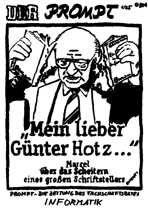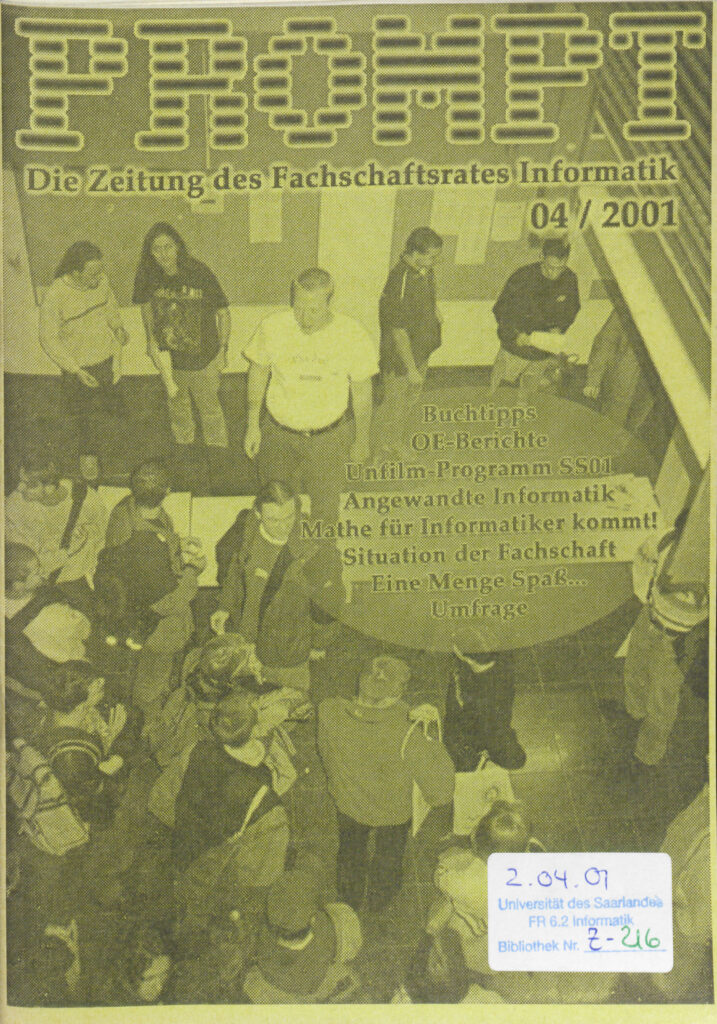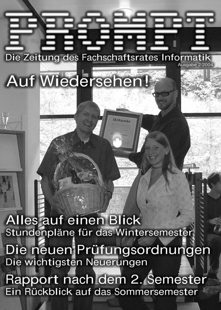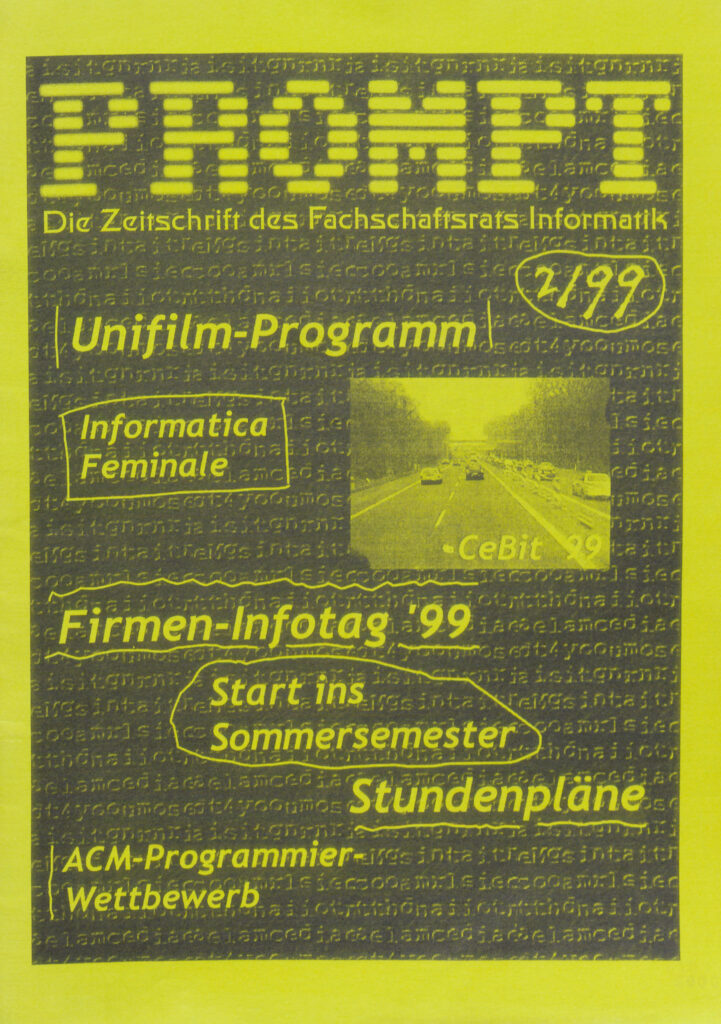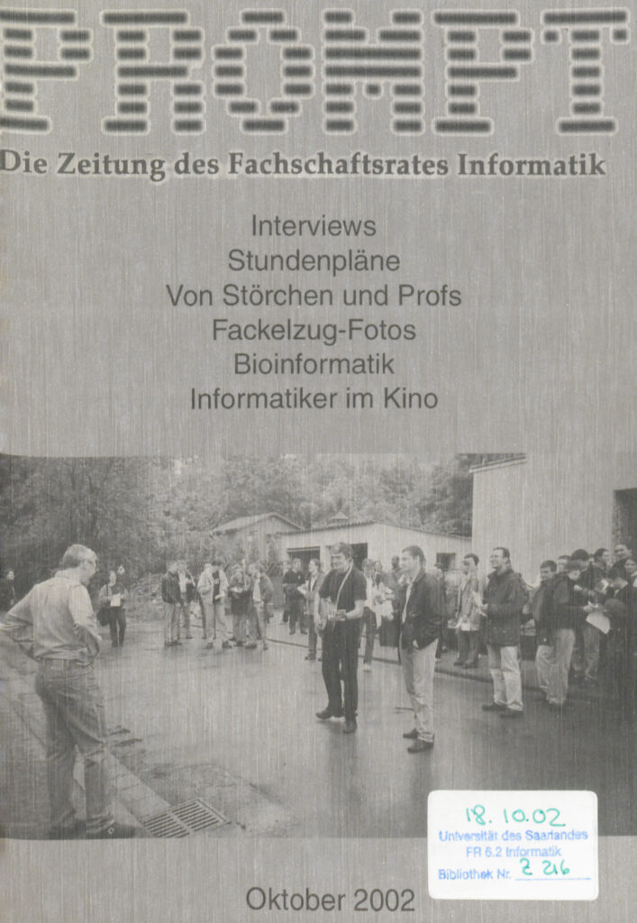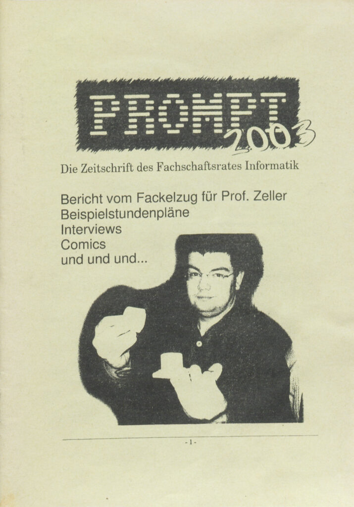 Die Prompt ist die ehemalige Zeitschrift des Fachschaftsrates Informatik, die von spätestens ab 1995 bis mindestens 2004 herausgegeben wurde. Die alten Ausgaben findest du im Untergeschoss der Campusbibliothek für Informatik und Mathematik. Momentan wird von uns auch daran gearbeitet sie zu retrodigitalisieren und online zugänglich zu machen.